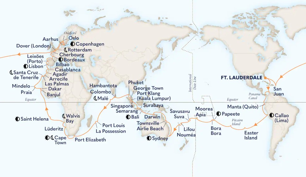 *US$9,900 per person, based on double occupancy, applies to the 129-Day Grand World Voyage – Roundtrip Fort Lauderdale – in a Pinnacle Suite.