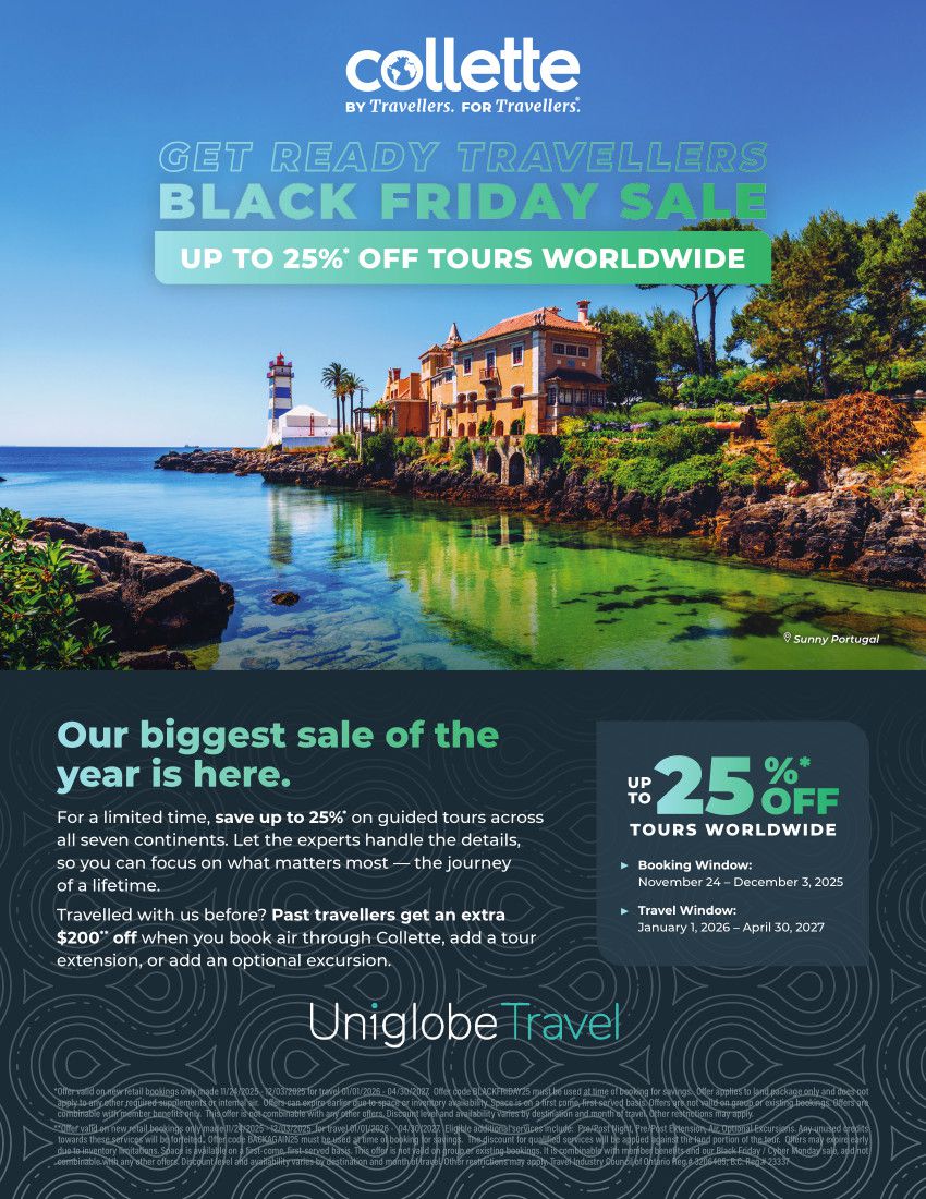 Conditions apply. Valid on travel booked through Uniglobe Travel. All advertised prices include or disclose taxes & fees. Prices and offers are valid for new bookings only. Air only prices are per person for return travel in economy class unless otherwise stated. Package, cruise, tour, rail and hotel prices are per person, based on double occupancy for total length of stay unless otherwise stated, and are applicable for the departure date listed at the advertising deadline. Pricing that includes airfare is valid only for the departure gateway listed. Airport transfers to/from the hotel may not be included and are supplier and destination specific. Some packaged travel products for certain destinations may include flight connections at an additional cost ($). Taxes & fees due during travel or in destination are additional and may include, but not limited to, local car rental charges & taxes, one-way car rental drop fees which are to be paid upon arrival, resort fees & charges, tour ‘kitty’ or local payment, airline baggage fees, departure taxes, and cruise gratuities. Prices are for select departure dates and are accurate and subject to availability at advertising deadline, errors and omissions excepted, and subject to change without notice by the supplier. Advertising deadline: November 18, 2025. For full terms & conditions please speak with a Uniglobe Travel consultant.