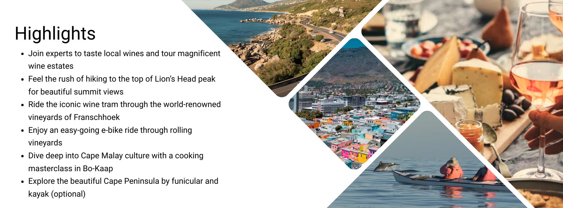 Experience the premier wine region in South Africa on a full-bodied exploration packed with fun, adventure and, yes, excellent wines. With the expert guidance of a local tour leader, you’ll explore the vineyards and mountains outside Cape Town on foot, e-bike, funicular, kayak and even on the iconic wine tram! Of course, there’s plenty of time to indulge your inner oenophile, stopping in historic wine estates, while our base for the adventure, the Protea Hotel Dorpshuis in Stellenbosch, provides a place to relax and unwind.