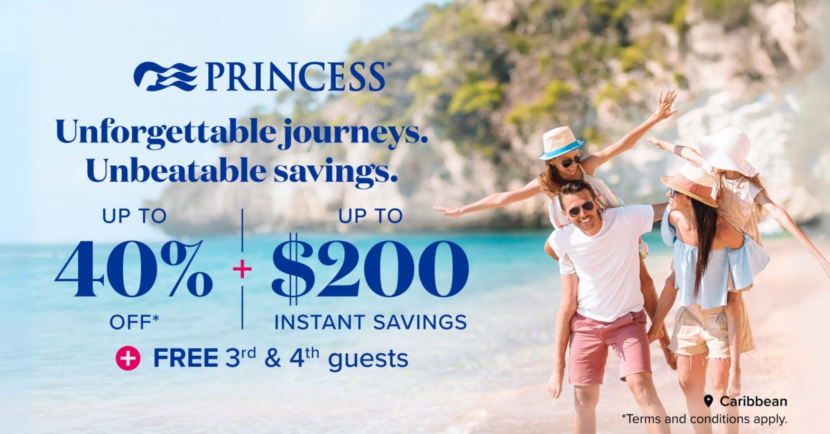 Up to 40% off fares Offer – This discount based off applicable Launch Fare and does not apply to Required Cruise Fees and Expenses and Government Taxes and Fees. Offer available on select categories and sailings. Discount amount is based on destination and stateroom category and does not apply to Princess Plus or Princess Premier packages or any tours, even when included in the advertised fare. This discount only applies to first two guests in a stateroom; 3rd/4th/5th guests are responsible for prevailing cruise rates.